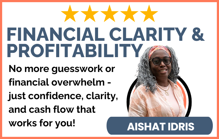 * To get the most out of this workshop, please complete the 3-Tab Financial Clarity and Profitability Toolkit before attending or watching the recording. This toolkit will guide you through your current business and personal finances, which Aishat will then help you use to develop tailored goals, actionable plans, and strategies for profitability.